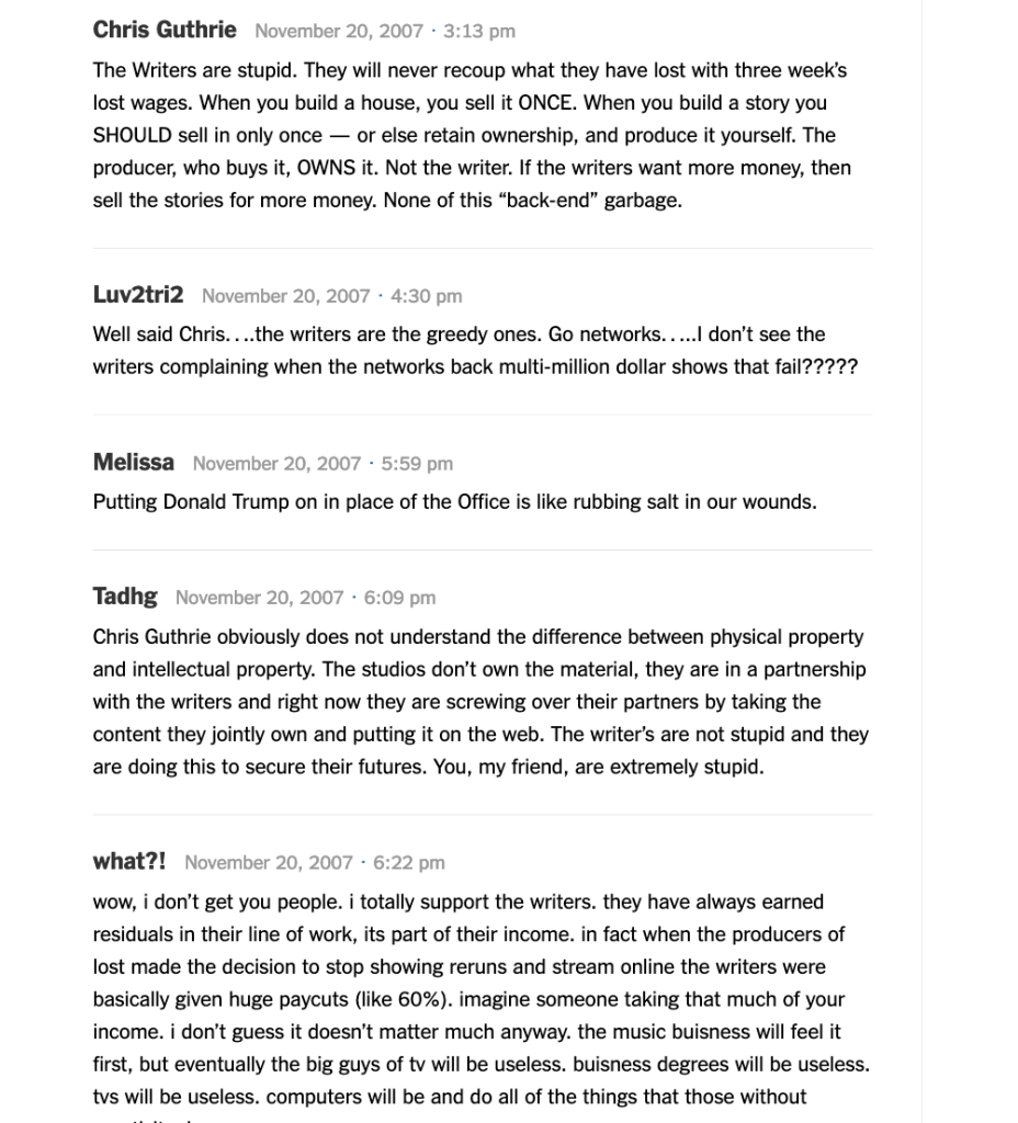 “wow, i don’t get you people. i totally support the writers. they have always earned residuals in their line of work, its part of their income. in fact when the producers of lost made the decision to stop showing reruns and stream online the writers were basically given huge paycuts (like 60%). imagine someone taking that much of your income. i don’t guess it doesn’t matter much anyway. the music buisness will feel it first, but eventually the big guys of tv will be useless. buisness degrees will be useless. tvs will be useless. computers will be and do all of the things that those without creativity do.”