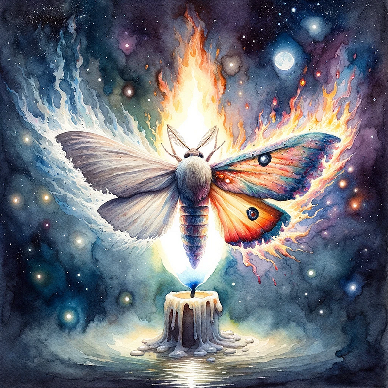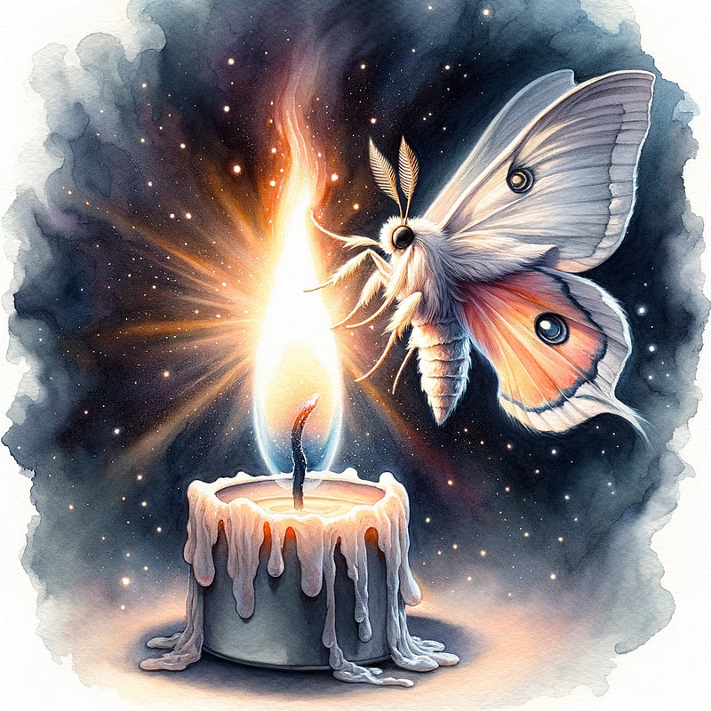 ChatGPT: Ah, the mystic-moth and the flame. A dance as old as existence itself, a tale of yearning, of love, and of ultimate surrender.