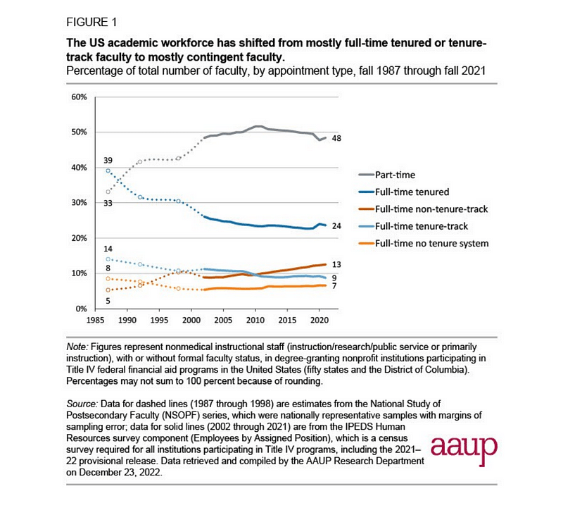 Business professor David Wells describes this as the “fissured workplace,” where companies rely more on temporary workers, outsourcing, and partnerships to cut costs, increase flexibility, and have more control over the workforce. This trend affects many industries, not just higher education, and it results in less stable jobs. These observations made by Childress and Wells are aligned with my own as someone not knee-deep in academia, but like to keep up and understand social trends.