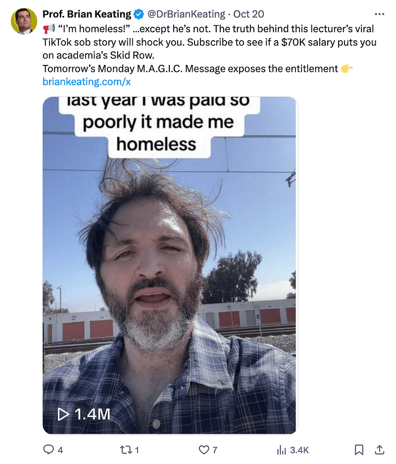 The University of California, Los Angeles (UCLA) professor who recently went viral on TikTok is Dr. Daniel McKeown, a lecturer in astrophysics. McKeown revealed that despite being paid around $70,000 annually, he is homeless due to the high cost of living in Los Angeles such as his $2,500 a month in rent. McKeown criticized the university for not paying him enough to cover basic living expenses. The video sparked widespread attention, with many expressing shock at his situation. Some comments and reactions were mixed, some were on his side and included people expressing no sympathy for his situation.