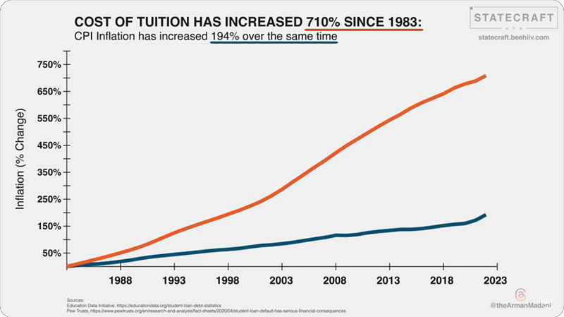 The high cost of healthcare and child care in the US does not excuse increasing tuition fees. School tuition alone has significantly outpaced inflation when properly adjusted — a systemic malaise that no one seems to figure out how to solve. This directly connects to the student loan debt crisis we are currently facing, a profound issue that burdens millions of borrowers and future students, thus threatening the economic stability of our society.