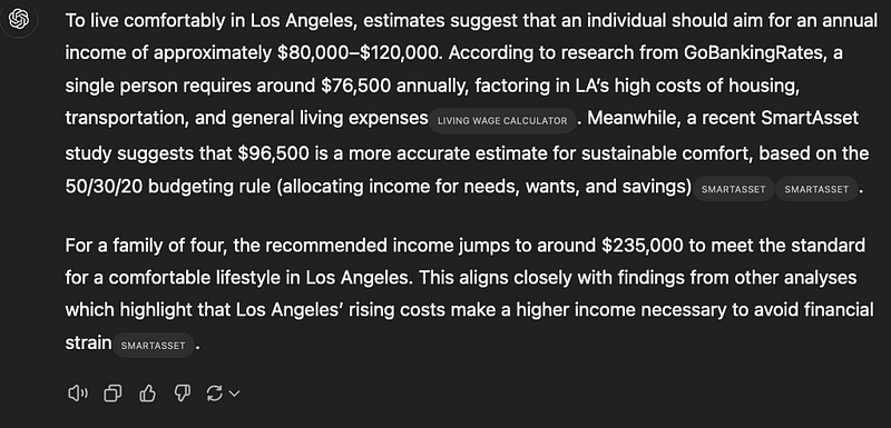 This estimate from this single website seems off and most likely to be wrong suggesting a single person can live there for far less and make about $35k annually, which would disprove McKeown’s plight. Other sources seem more accurate, saying roughly $80k — $120k is ideal for an individual living in LA.