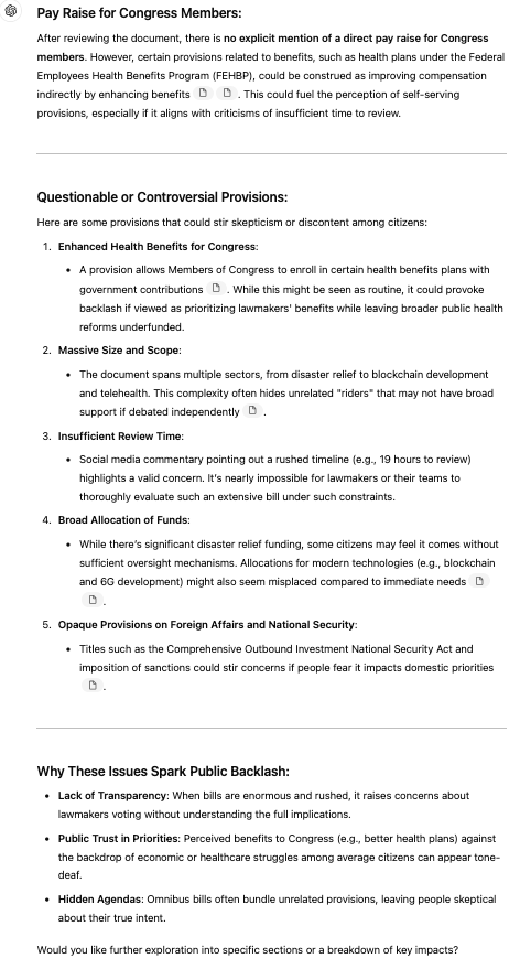 Another point someone said is that there is a pay raise for congress members in this document. Is this true? Also, do you find anything odd or questionable in the bill that might enrage or at least bring skepticism to citizens?
