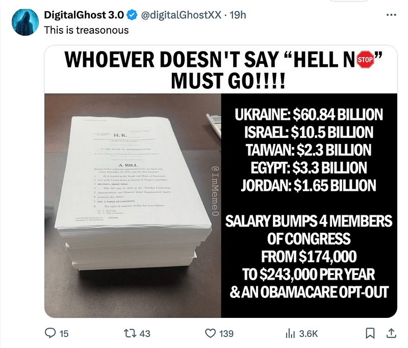 - The post simplifies complex appropriations into inflammatory talking points (e.g., massive pay raise claims without evidence).