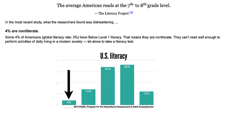 I think most people would agree that education is probably the most important ingredient in determining someone’s future success. Hence why there is a great emphasis and discussion to continue funding and improving the schools in the nation. Here are some shocking statistics: On average, 79% of U.S. adults nationwide are literate in 2024. 21% of adults in the US are illiterate in 2024. 54% of adults have a literacy below a 6th-grade level (20% are below 5th-grade level). Low levels of literacy costs the US up to 2.2 trillion per year. Another source stated, “The average American reads at the 7th- to 8th-grade level.”