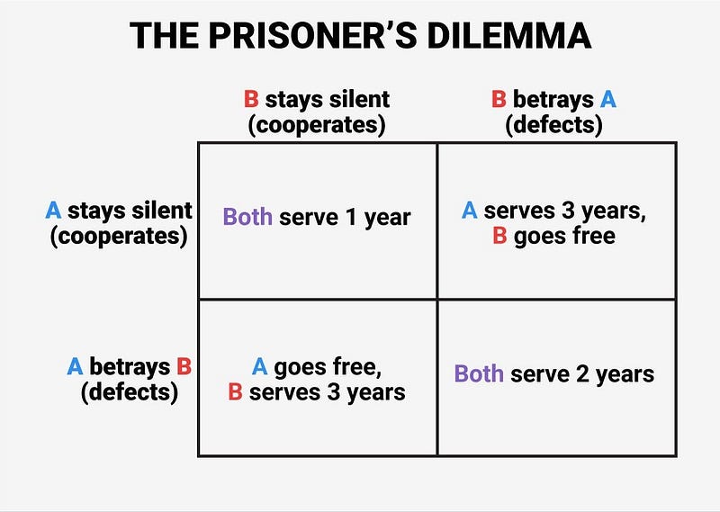 The classic example often used to explain game theory is the Prisoner’s Dilemma: