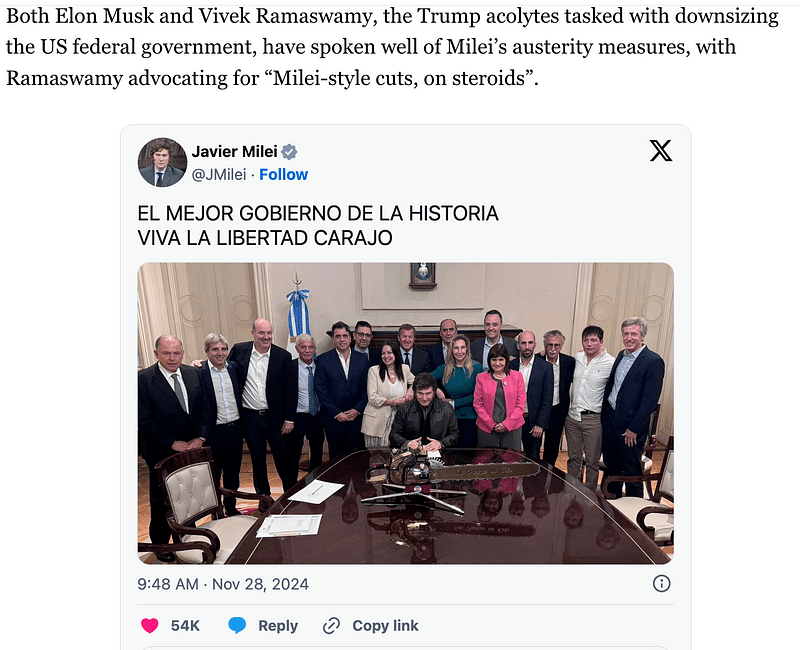 - You mention Argentina’s president (Javier Milei, presumably) as an example of a leader taking extreme austerity measures, and note that he’s receiving praise from figures like Elon Musk.