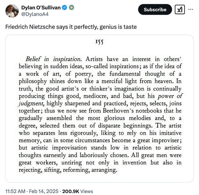 Nietzsche’s Human, All Too Human aligns with our discussion by demystifying the idea of divine inspiration and emphasizing the importance of selection and refinement. However, he goes further — he argues that the very question of “inspiration vs. refinement” is shaped by history. This forces us to ask:
