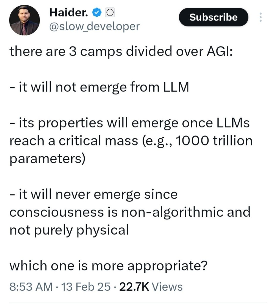 AGI may not be an entity but an emergent property of a broader AI ecosystem. Perhaps the question should not be “Will AGI emerge?” but “What does emergence look like?” and “Will we recognize AGI when it arrives?”