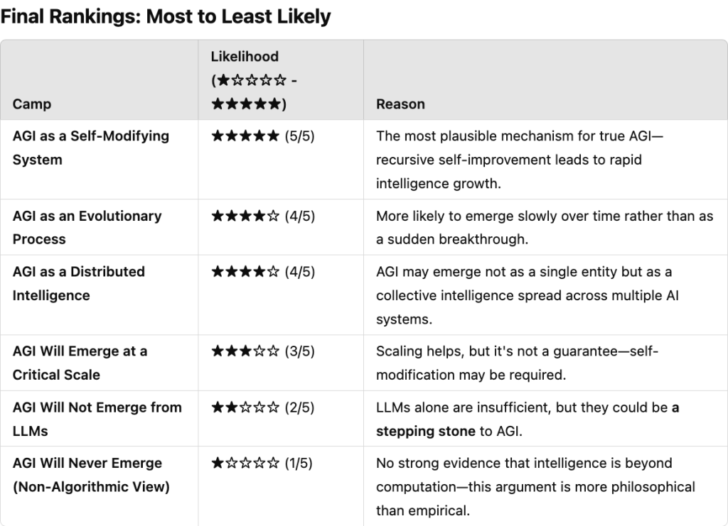 ➡️ Final Verdict: Self-modification is the key—once AI can improve its own cognition, AGI becomes inevitable.