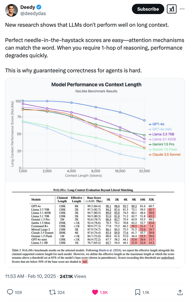 “LLMs degrade significantly with long context, with most models struggling beyond 8K tokens. Simple retrieval is relatively easy, but multi-hop reasoning over long spans is still a major weakness. Some models (GPT-4o, Claude 3.5 Sonnet) retain reasonable performance, but others collapse quickly. Long-context reliability remains a bottleneck for AI agents requiring deep memory retention.”