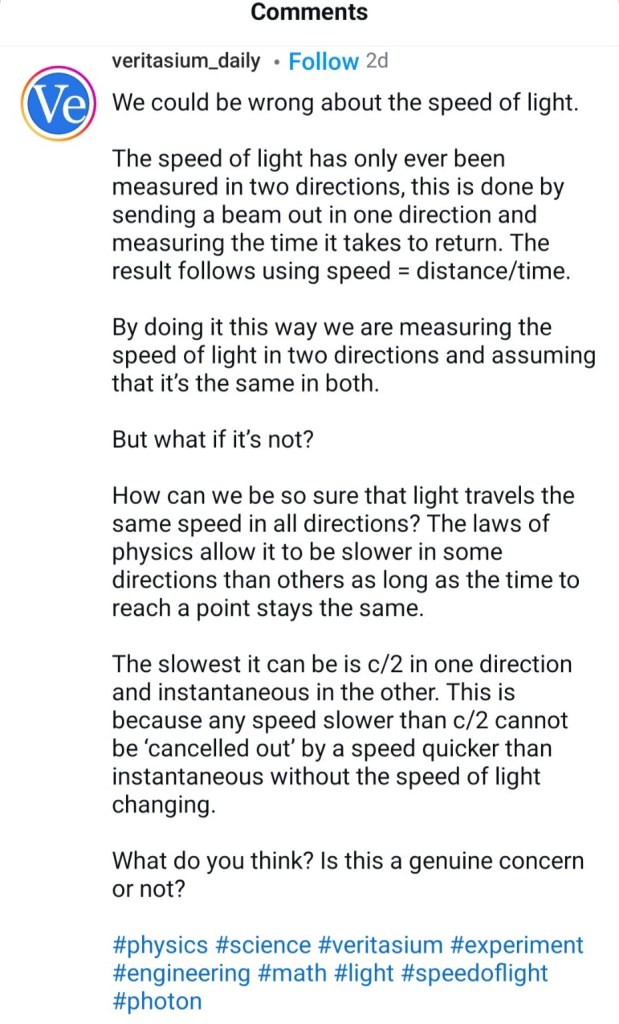 The claim in the image suggests that we might be wrong about the speed of light because it has only been measured in two directions using a round-trip method (sending a beam out and measuring the time it takes to return). It raises the question of whether light could travel at different speeds in different directions, as long as the total travel time remains consistent.
