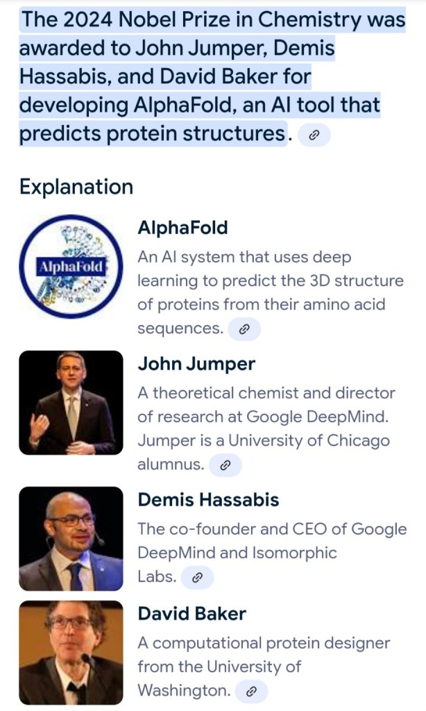 ChatGPT: This claim about the 2024 Nobel Prize in Chemistry being awarded for AlphaFold seems intriguing, but I would first want to verify its accuracy. As of my last knowledge update, AlphaFold has been recognized as a groundbreaking AI system in protein structure prediction, and its creators, John Jumper and Demis Hassabis of DeepMind, along with David Baker, a computational biologist, have been widely praised. If this is indeed true, it would be one of the first major Nobel recognitions for AI-driven scientific discovery, marking a significant moment in the history of artificial intelligence and its role in fundamental science.