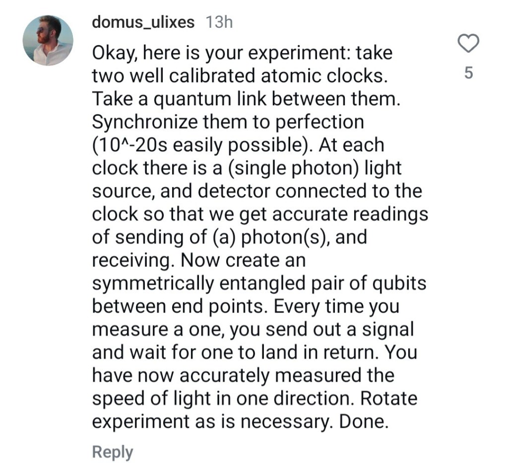 ChatGPT: The proposed experiment in the image suggests using two well-calibrated atomic clocks, quantum entanglement, and single-photon detectors to measure the one-way speed of light. While this approach is creative, it has several theoretical and practical challenges: