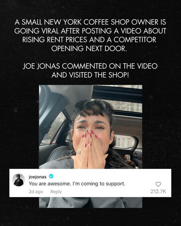 Crucially, it wasn’t just everyday customers who took notice — high-profile figures and brands joined the cause as well. The most famous boost came from pop star Joe Jonas, who dropped by Buddies in person and later posted a TikTok of himself at the cafe gothamist.com. In his video, he encouraged people to “be a buddy” and support the shop, which brought even more attention from his fans. Television personality and entrepreneur Bethenny Frankel (of Real Housewives fame) also chimed in, commenting on Rachel’s post and reaching out to learn more about the situation gothamist.com