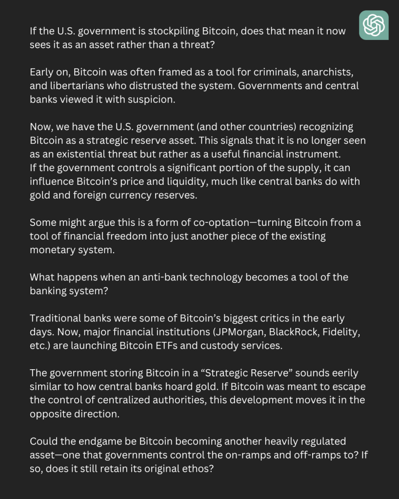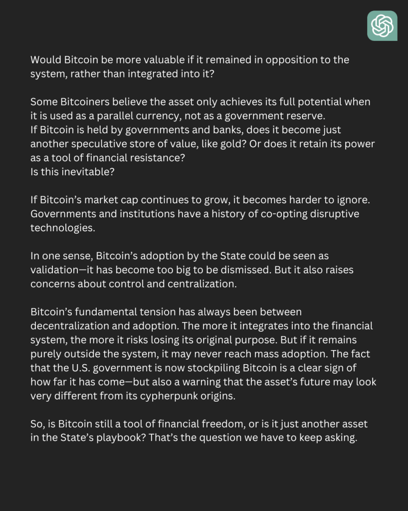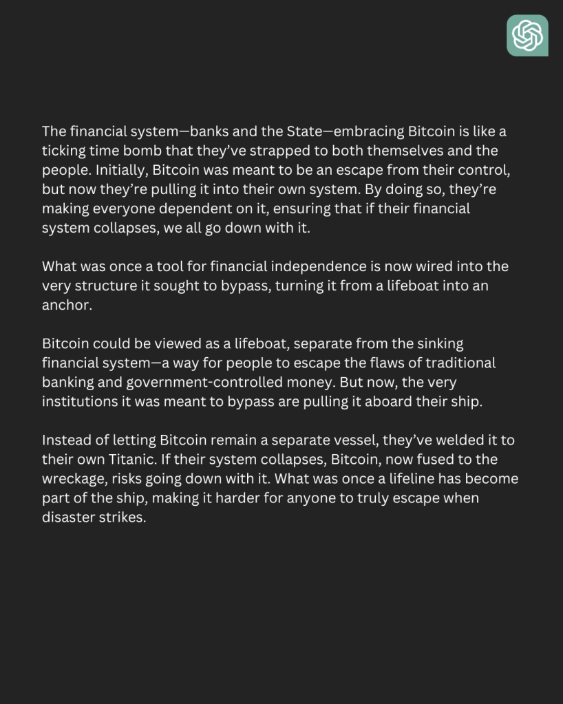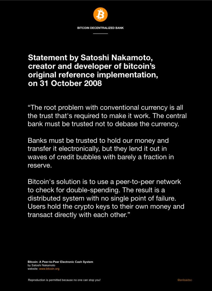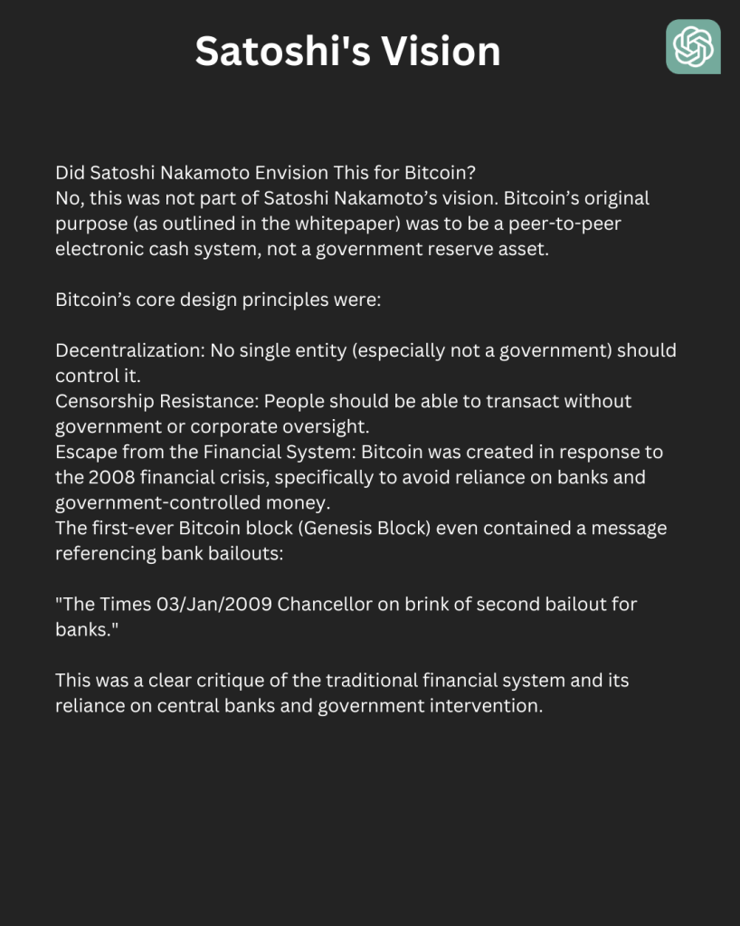 I don’t believe Satoshi Nakamoto ever imagined their creation to turn out like this. Yet, who is to say if they would approve of it or not. It’s difficult to say. I’m of the opinion that a digital asset like Bitcoin is best when it is a separate entity rather than co-opted by the State and financial sector.