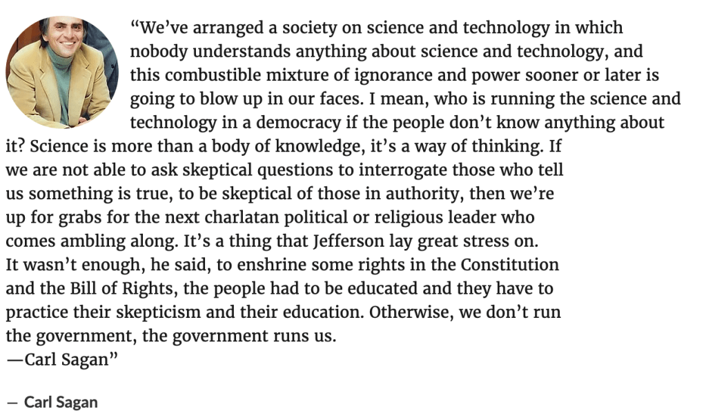 Critical thinking is another important skill that could be at risk as society continues to outsource the mind to computers, let alone AI. The late Carl Sagan said something to the effect that we’ve arranged society in a way that revolves around science and technology, while our democracy, or most of our population, has nearly the faintest clue on how it works. Meanwhile, those in power have inherited this great technological prowess from the shoulders of giants without a deep understanding of it, only its implications, and this is an invitation of a recipe for disaster. I would advise using technology wisely, sparingly, and, of course, ethically.