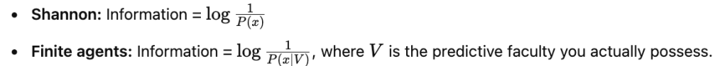 - But in the asymptotic state—when V-information is maximized— There is no surprise left. The world fits because you are now shaped like it.