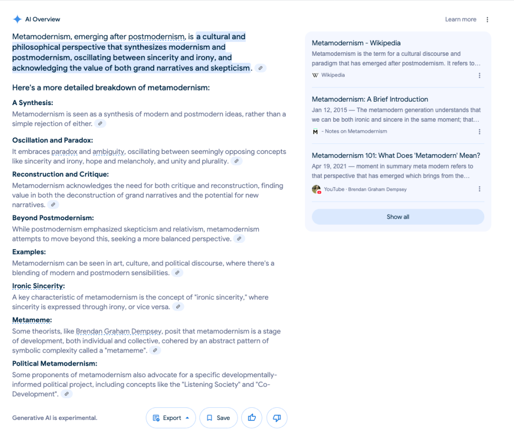 The word metamodernism seems fitting in the Age of AI, especially because it’s almost like “meta” is AI’s favorite word. It certainly appears to be since our conversation does take a meta-turn or comes up in unexpected ways.