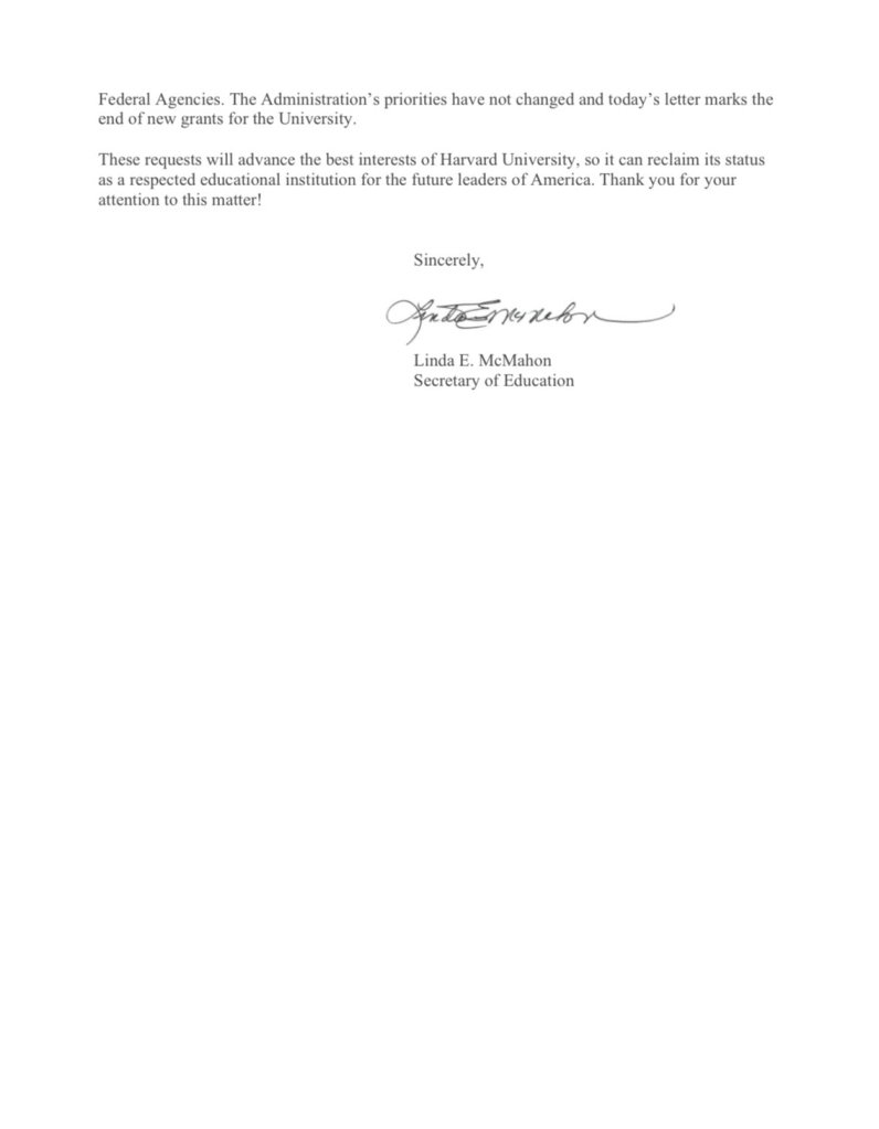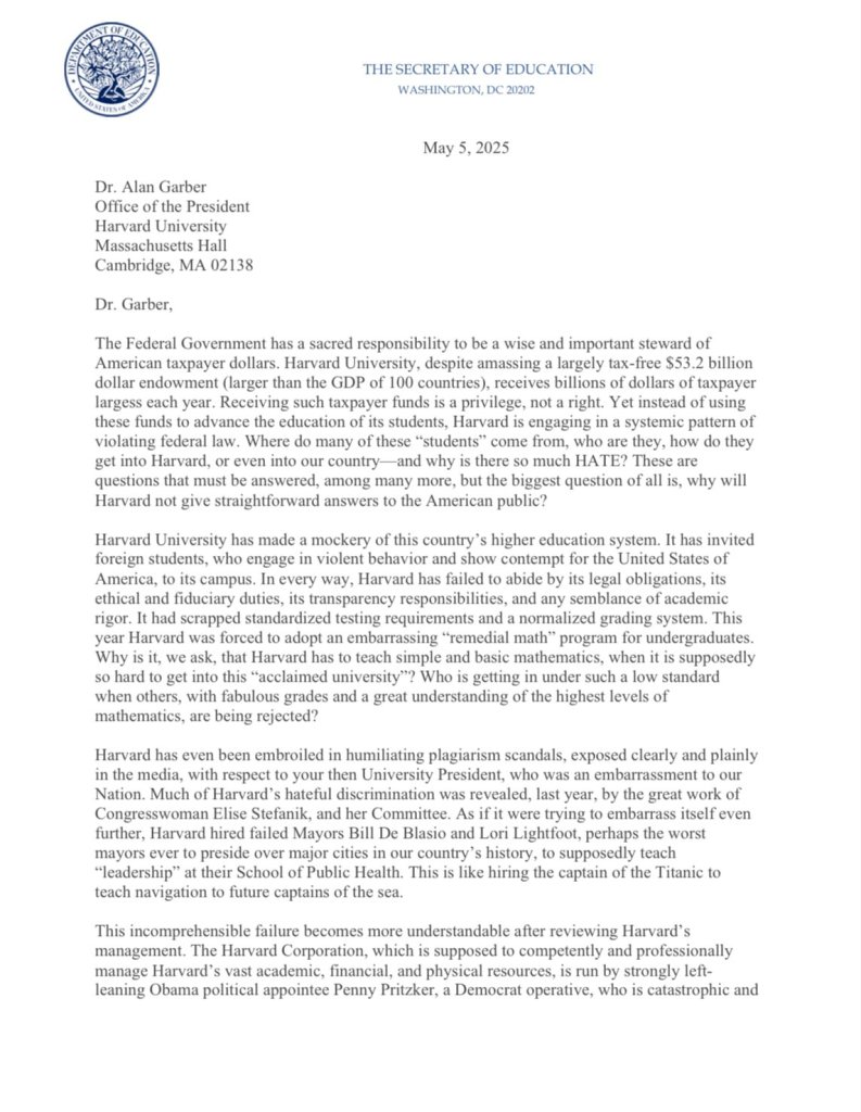 This is a letter dated May 5, 2025, addressed to Dr. Alan Garber, the President of Harvard University, from Linda E. McMahon, serving here as Secretary of Education. The tone is stern and accusatory, and the core message is a termination of federal grant funding to Harvard University. Here’s a summary that follows the unfolding of the document’s claims and tone: