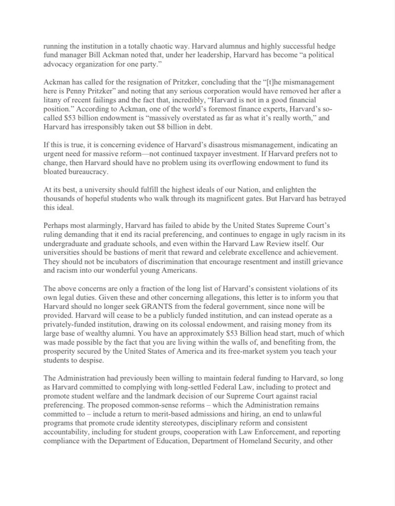 This letter is both a policy announcement (termination of federal grants) and a public condemnation of Harvard. It positions the university as morally, administratively, and legally compromised, and uses this to justify the withdrawal of public funds.