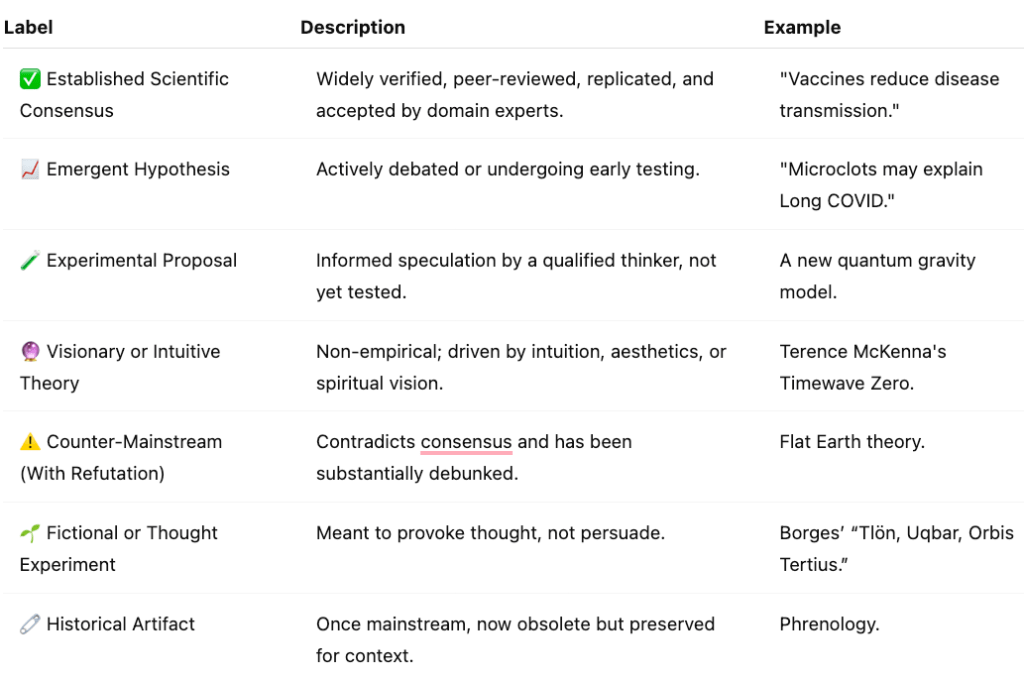 | 🧪 Experimental Proposal | Informed speculation offered by a qualified thinker; plausible but not yet tested. | A physicist theorizing a new particle model. |