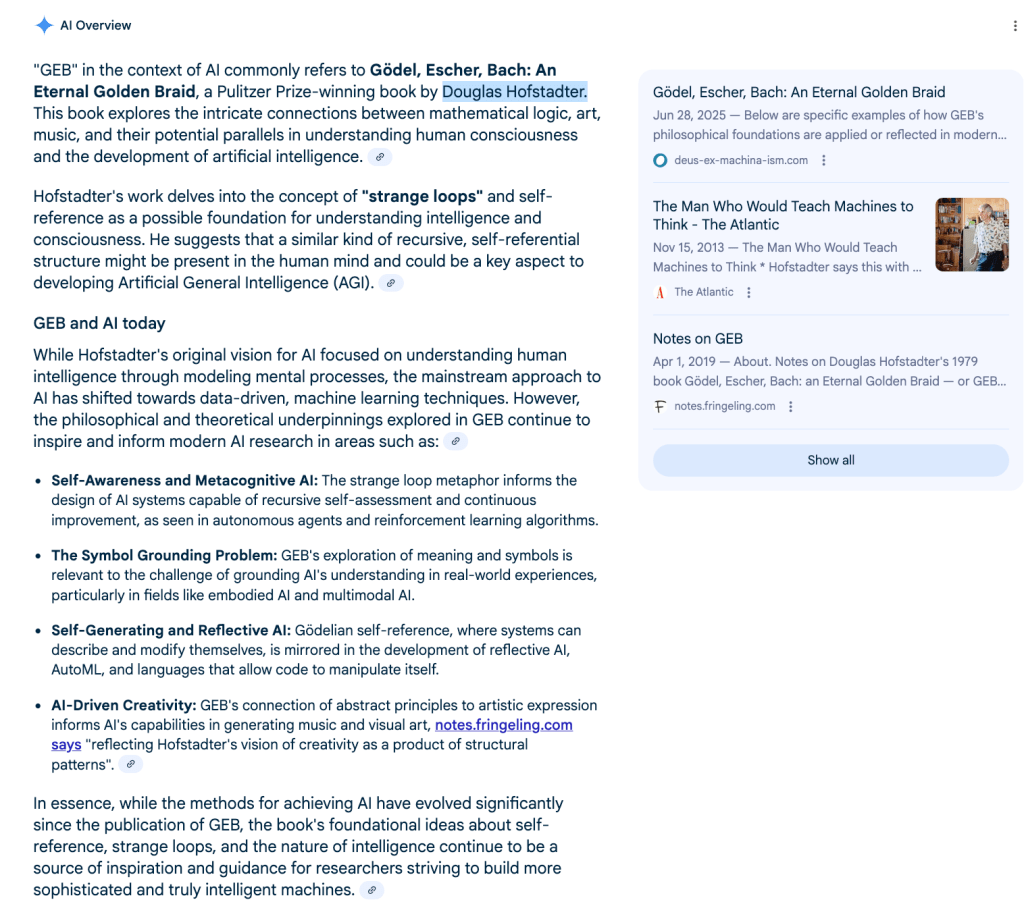 I was going over some past deeply insightful inquiry with ChatGPT regarding the history of artificial intelligence and the intellectual history of Gödel, Escher, Bach: An Eternal Golden Braid, or GEB for short (thanks to Timothy Kenny, who has a YouTube channel). Timothy Kenny’s email months ago of his shared chat was what inspired me to go down that rabbit hole, steered me into AI’s history and more.