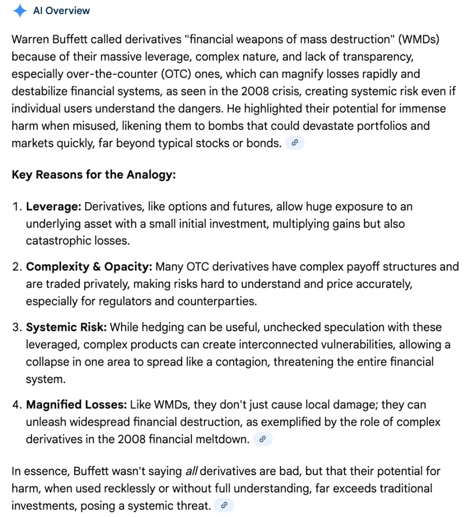 Steve Eisman, another character played by Steve Carell in The Big Short, simplified the main factors of the 2008 financial crisis in layman’s terms in a recent video that’s worth a listen. Seriously, he is one of the folks who explained it best. The four pillars that caused the 2008 crisis, according to Eisman, were (1). High Leverage, (2). A Major Asset Class Blowing Up (e.g., housing), (3). Systemically Important Institutions Owned the Bad Paper, and (4). Derivatives (The Invisible Web That Connected Everyone to Everyone). Derivatives, in Eisman’s view, are what made 2008 special compared to other bubbles since it was these financial instruments like Credit Default Swaps that made systemically important banks interconnected like a spiderweb around the whole world, where if one fails, that could cascade into another, and then another to fall, and so forth. This is the main reason why Warren Buffett called derivatives “financial weapons of mass destruction.”