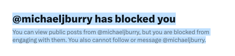 Funny enough, Michael Burry blocked me from my main X account. Before his return, I was unable to see his posts until now. I followed others who reposted his tweets. I think at first I took the block personally since I was new to Twitter, but then I let it go, and didn’t take it personally. I could speculate why he blocked me, but it doesn’t matter. The one time I engaged with his post was when I was being critical of one of his social stances and political views. I was never malicious or attacked him personally, but simply critiqued some of his blind spots when it came to social matters. That’s probably one of the main reasons why I was blocked, other than looking like a spam/bot account. Now I can see his official public account and posts, but unable to interact with it on X.